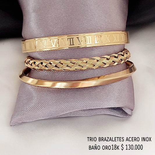 Trío brazalete acero inox baño oro18k